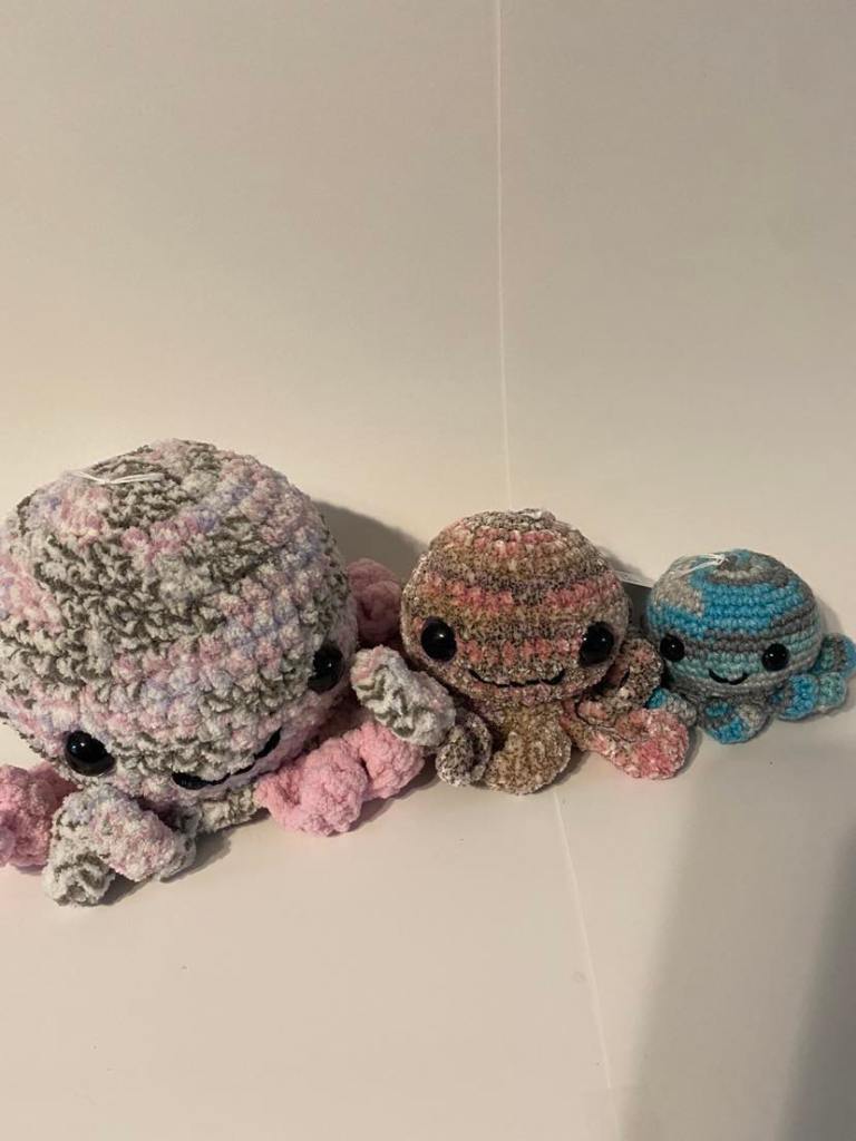 Dive into the enchanting world or our crochet octopi! Lovingly crafted with meticulous detail, each octopus is handmade using cotton, acrylic, chenille, or blanket yarn, for a soft and huggable texture. With their eight tentacles and mesmerizing colors, these adorable creatures are perfect for imaginative play, snuggling, or as a charming addition to any room décor. Whether as a gift for a little one or a whimsical treat for yourself, our crochet octopi are sure to captivate hearts and inspire endless adventures under the sea.